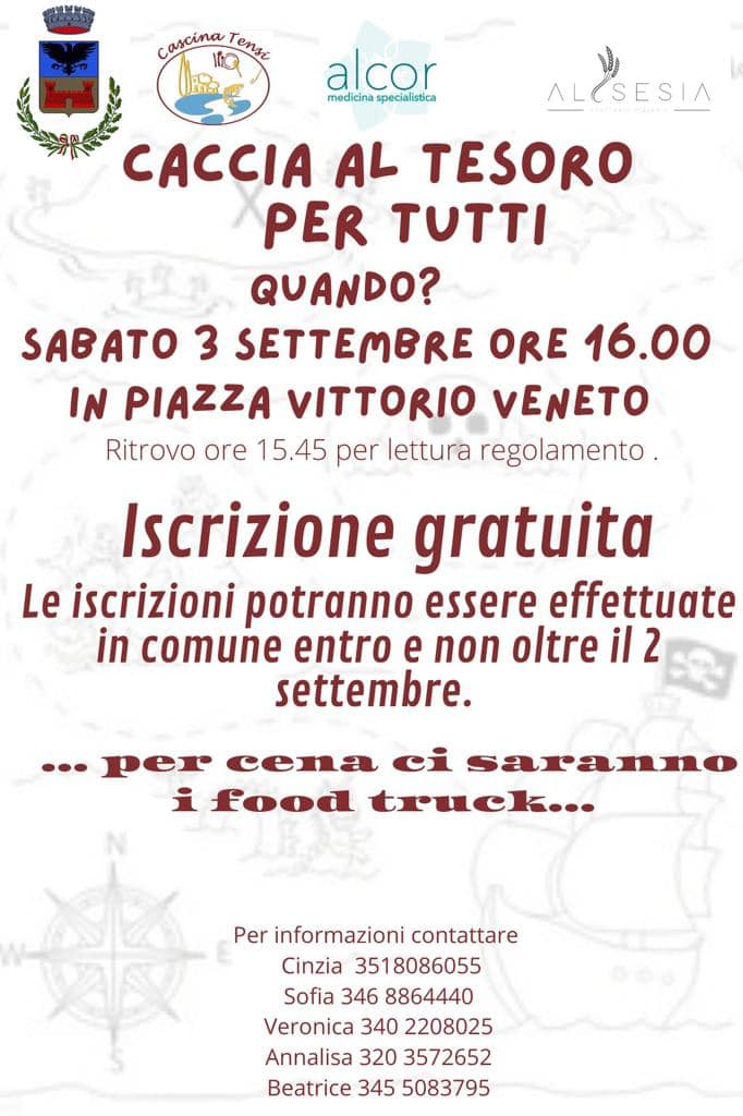 Caccia al tesoro per tutti con ricchi premi offerti dagli sponsor che ringraziamo: Alcor - Cascina Tensi - Al Sesia - 3 settembre ore 16 piazza Vittorio Veneto (ad iscrizione)