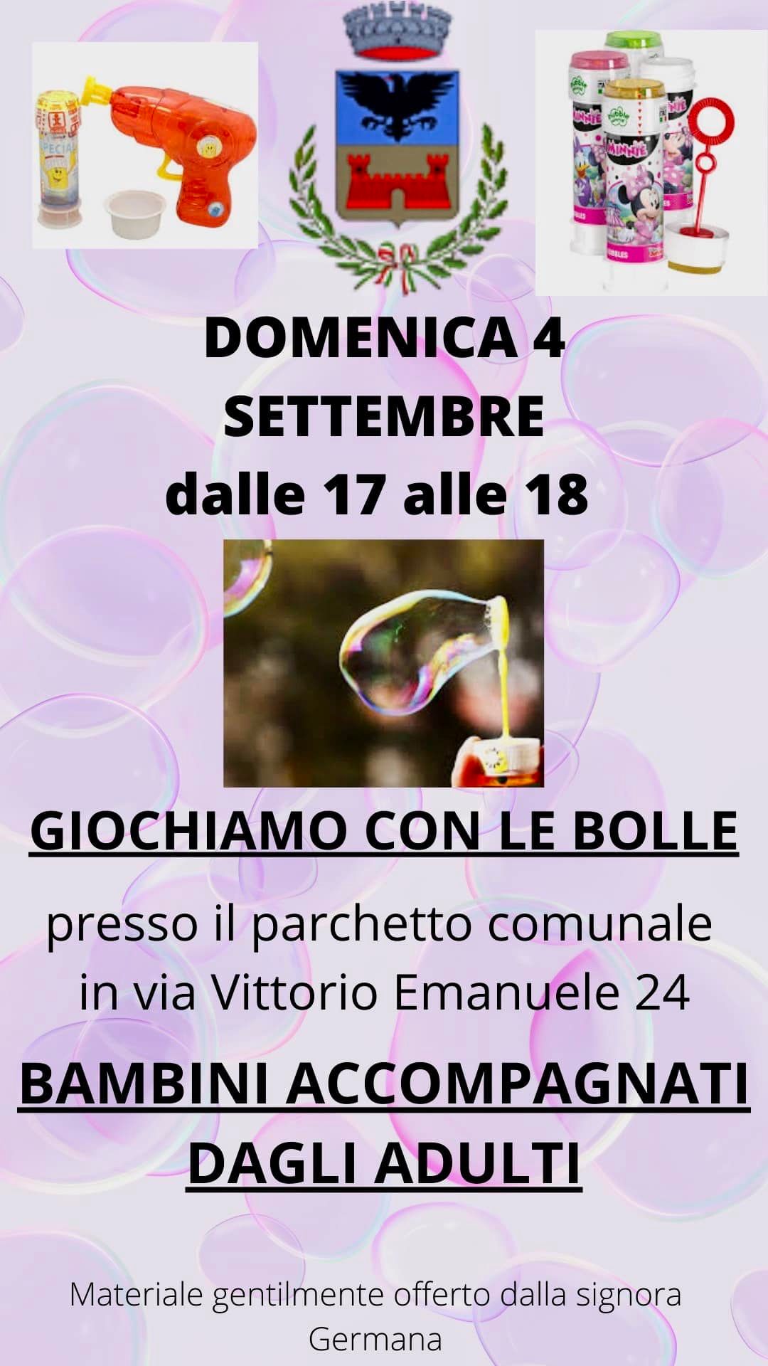 Domenica 4 settembre dalle 17 alle 18 - Giochiamo con le bolle! - Presso il parchetto comunale in via vittorio emanuele 24 -per bambini accompagnati da adulti- Ringraziamo la signora Germana per il materiale.