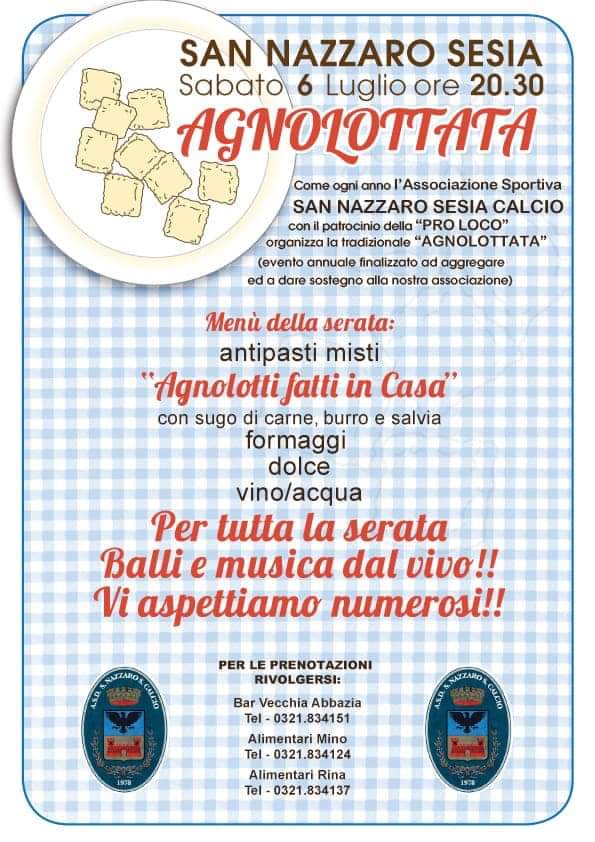 L'Associazione Sportiva San Nazzaro Sesia Calcio, con il patrocinio della Pro Loco, organizza la "tradizionale Agnolottata" (evento annuale finalizzato ad aggregare ed a dare sostegno all'associazione)