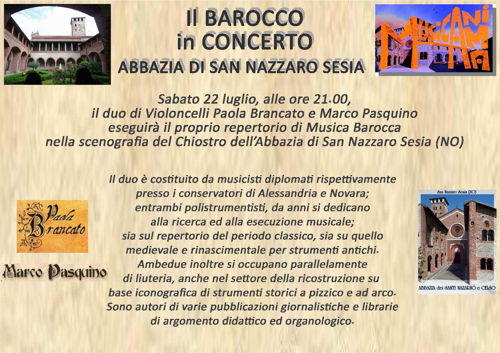 Sabato 22 luglio - ore 21,00 - Chiostro dell'Abbazia di San Nazzaro Sesia - Continua l'iniziativa di "Musicanima" con un nuovo appuntamento: sabato 22 luglio - duo di Violoncelli Paola Brancato e Marco Pasquino con repertorio di musica barocca. Vi aspettiamo numerosi. Ingresso libero.