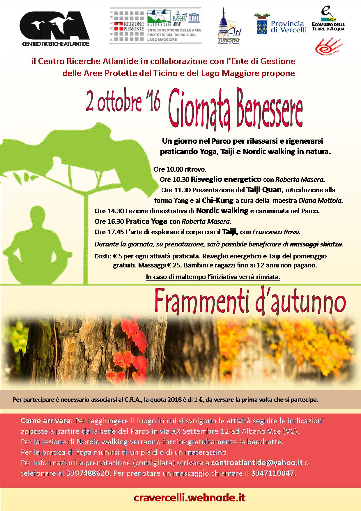 Le iniziative di “Frammenti di autunno” prendono il via domenica 2 ottobre al Parco delle Lame del Sesia con la “Giornata benessere”, un’occasione per rilassarsi, rigenerarsi e prendersi cura di sé. Si sa infatti che lo sport fa bene e fa ancora meglio se viene praticato in un ambiente naturale, lontano da rumori molesti e dallo smog cittadino, in un piacevole contesto conviviale. Il ritrovo è per le ore 10 al Parco (seguire le indicazioni apposte a partire dalla sede del Parco situata ad Albano V.se (VC) in via XX Settembre 12), per iniziare alle 10.30 con il “risveglio energetico”, una breve sessione di esercizi yoga per riattivare mente e corpo. Dalle 11.30 alle 12.30 esperti e neofiti potranno cimentarsi con il Taiji e il Chi Kung, guidati dalla maestra Diana Mottola. Dopo la pausa pranzo, alle ore 14,30, la guida del Parco Anna Pepe, in seguito a una breve lezione introduttiva al Nordic walking, accompagnerà i presenti lungo una rilassante passeggiata nel Parco. Le bacchette da nordic walking saranno fornite gratuitamente a chi ne fosse sprovvisto. Alle 16.30 sarà la volta delle asana di Hata Yoga proposte da Roberta Masera (portare un materassino o un plaid). Francesca Rossi concluderà la giornata con una breve lezione dimostrativa di Taiji, inteso anche come arte di esplorare il corpo.