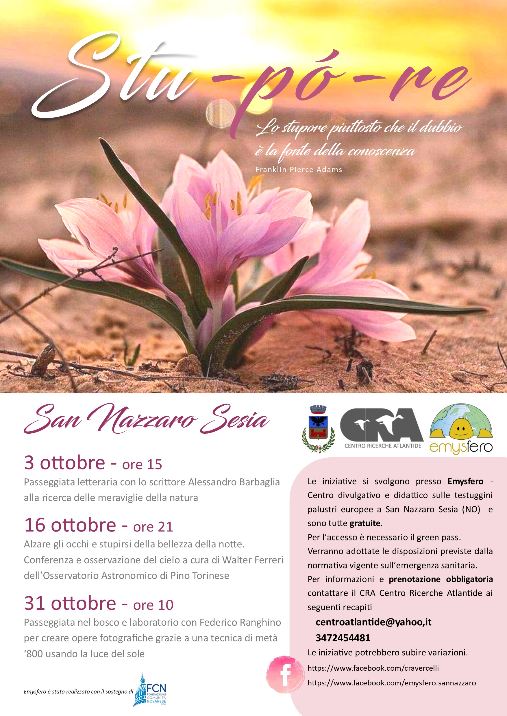Lo stupore piuttosto che il dubbio è la fonte della conoscenza (Franklin Pierce Adams)... Per questo motivo il CRA ha pensato a tre appuntamenti che possano avvicinarvi alla meraviglia della natura. Vi aspettiamo a San Nazzaro Sesia/ Emisfero nel mese di ottobre. Seguiranno informazioni dettagliate.