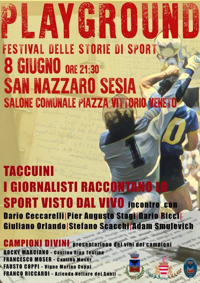 Venerdì 8 giugno alle 21,30 presso il Salone Comunale in Piazza Vittorio Veneto All'interno della rassegna "Playground - Festival delle storie di sport" - Il Comune di San Nazzaro Sesia è lieto di presentarvi, un incontro dal titolo "Taccuini - i giornalisti raccontano lo sport visto dal vivo" con Dario Ceccarelli - Pier Augusto Stagi - Dario Ricci - Giuliano Orlando - Stefano Scacchi - Adam Smulevich. nell'ambito della serata verranno inoltre presentati i "Campioni divini" - i vini dei campioni. Vi aspettiamo numerosi!