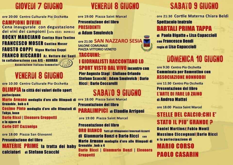 Venerdì 8 giugno alle 21,30 presso il Salone Comunale in Piazza Vittorio Veneto All'interno della rassegna "Playground - Festival delle storie di sport" - Il Comune di San Nazzaro Sesia è lieto di presentarvi, un incontro dal titolo "Taccuini - i giornalisti raccontano lo sport visto dal vivo" con Dario Ceccarelli - Pier Augusto Stagi - Dario Ricci - Giuliano Orlando - Stefano Scacchi - Adam Smulevich. nell'ambito della serata verranno inoltre presentati i "Campioni divini" - i vini dei campioni. Vi aspettiamo numerosi!