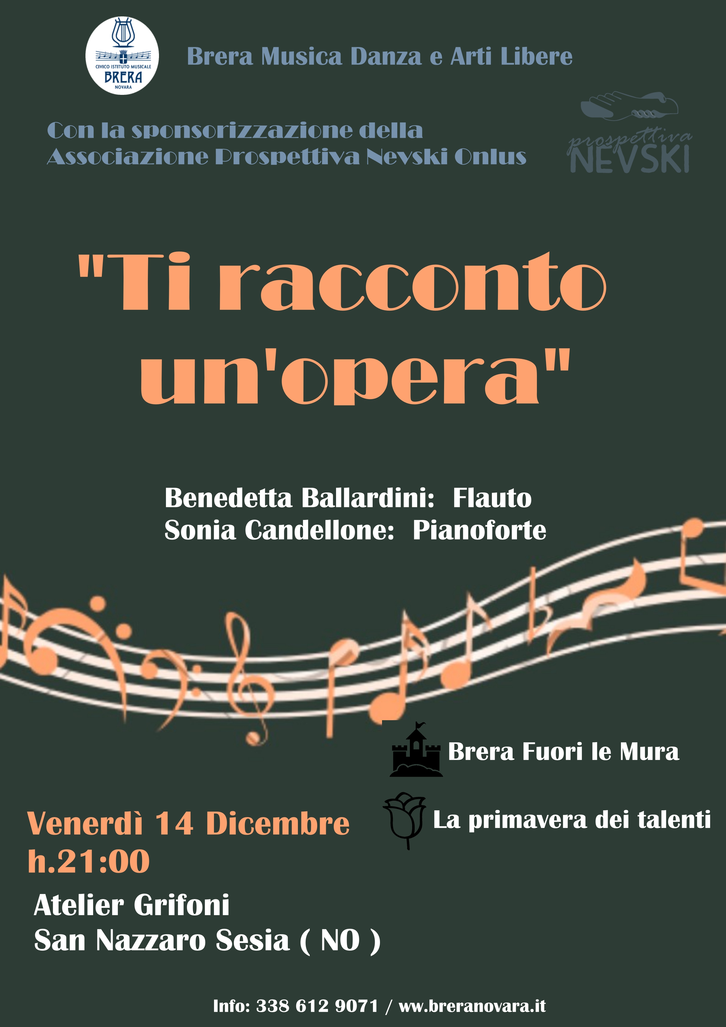 Venerdì 14 dicembre, alle 21,00 - L'atelier di Daniela Grifoni apre al pubblico per il concerto "Ti racconto un'opera" con Benedetta Ballardini al flauto e Sonia Candellone al pianoforte curato dall'Istituto Civico Brera Musica Danze a Arti Libere.