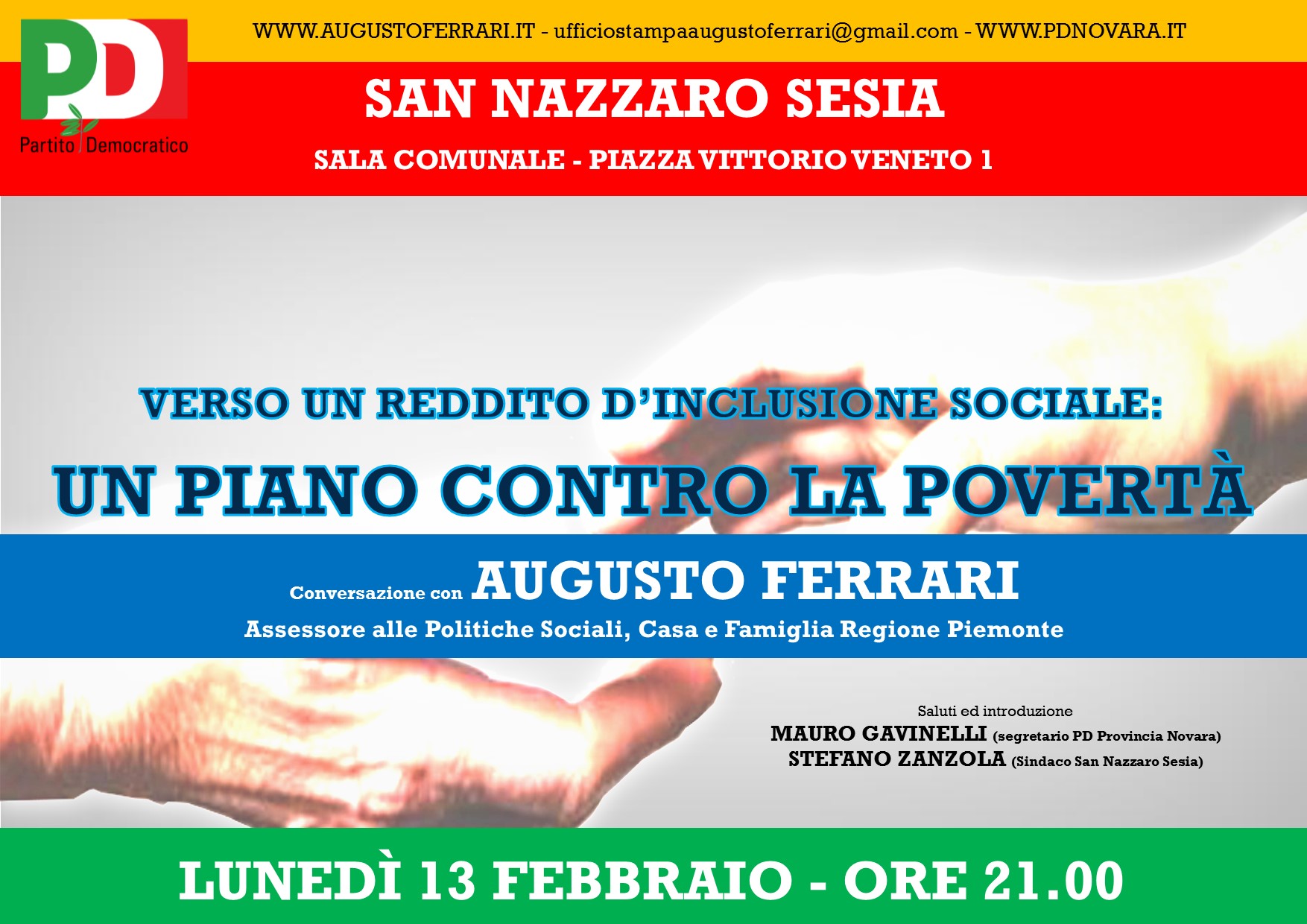 Un piano contro la povertà; conversazione con Augusto Ferrari, Assessore alle politiche sociali, casa e famiglia Regione Piemonte. L'incontro si terrà presso il salone comunale alle ore 21:00. Siete tutti invitati a partecipare.